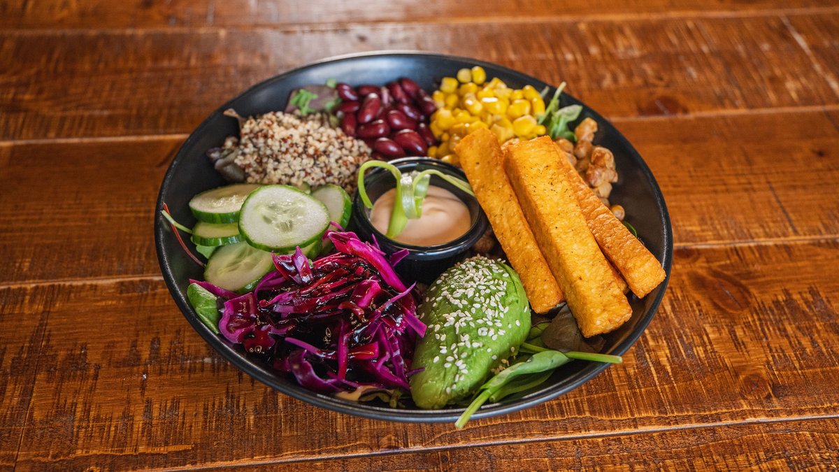 Topped with melted vegan cheese, barbecue beyond mince