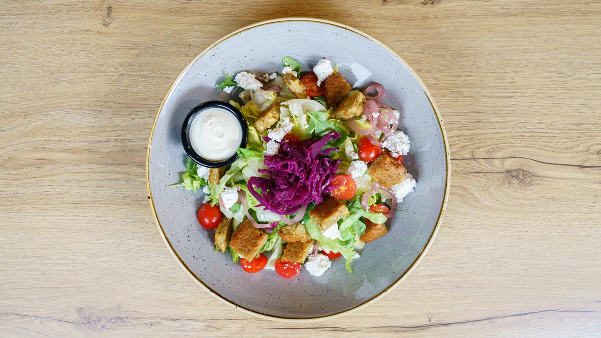 Crispy falafel, fresh greens, juicy tomatoes, red onions, and creamy feta, topped with zesty cabbage pickle