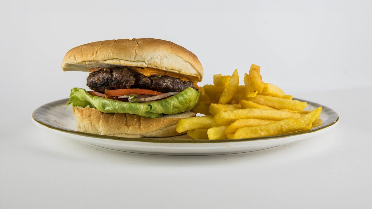 Angus beef burger extra cheese with lettuce, onion, and tomato. Served with salad and chips