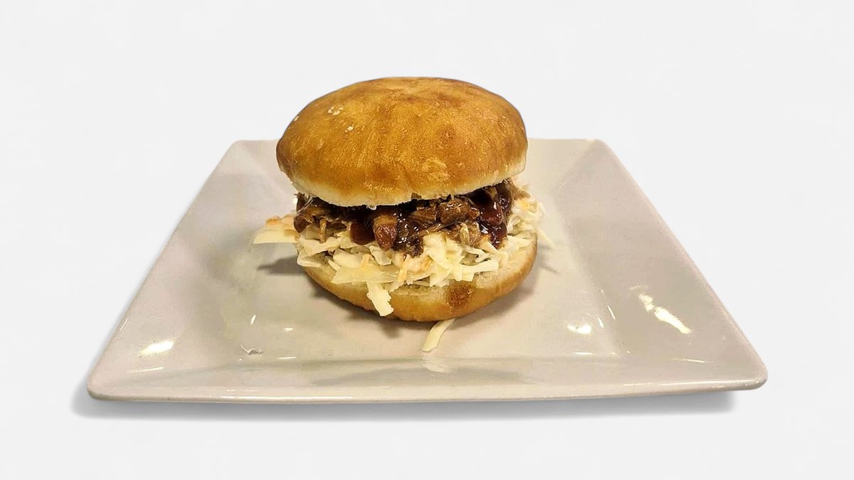 Toasted Donut Bun Filled with BBQ Pulled Pork, Coleslaw & Cheese