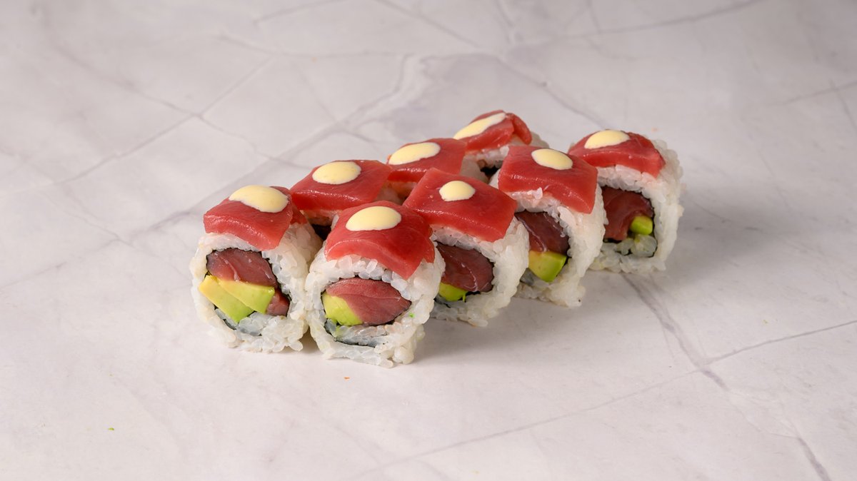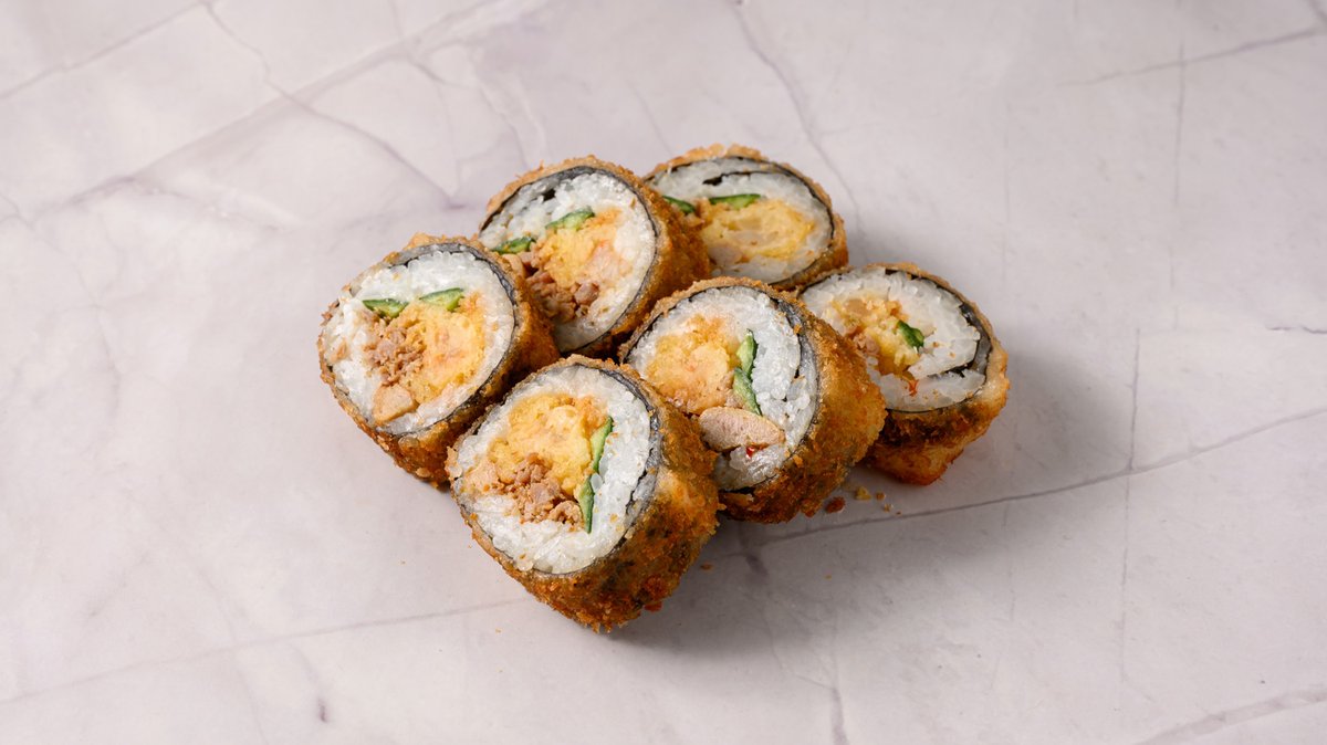 Grilled tuna, Prawn tempura, Cucumber, Deep Fried with Tempura Butter, Topped Spring Onions, Spicy Mayo & Teriyaki sauce.