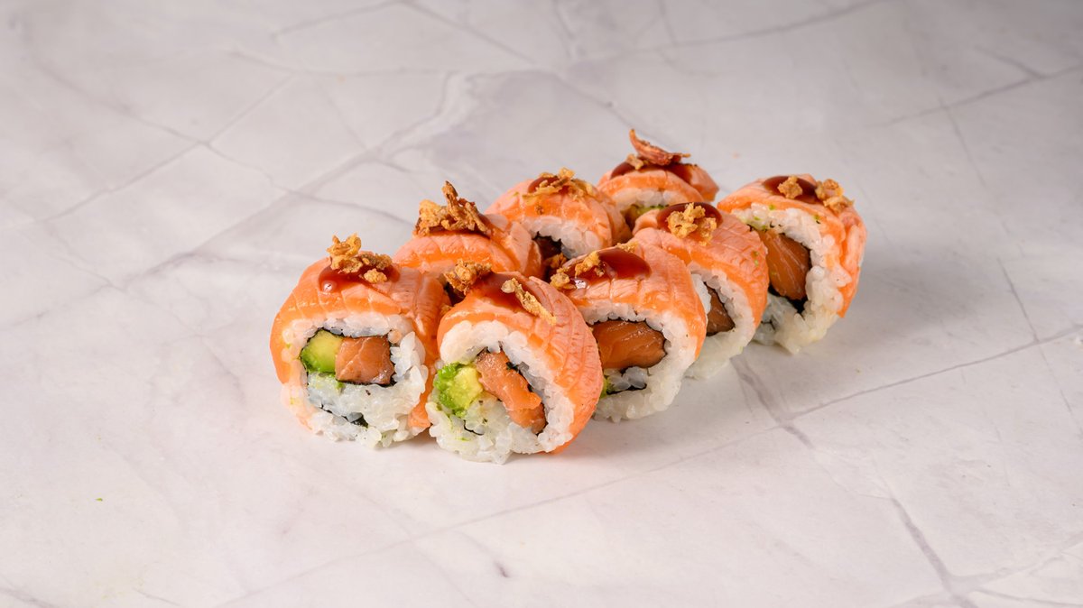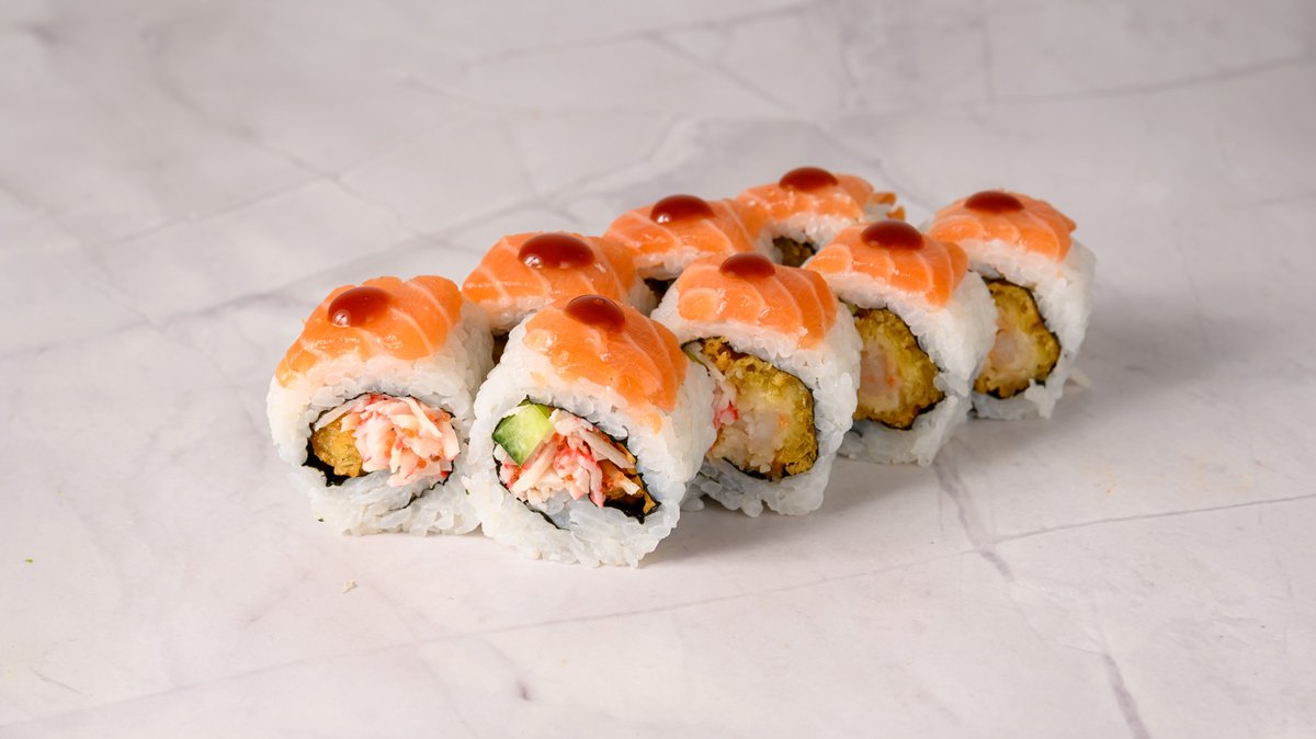 Prawn Tempura, Cucumber, Mixed Crab Stick, Tobiko, Topped Salmon with Teriyaki Sauce.