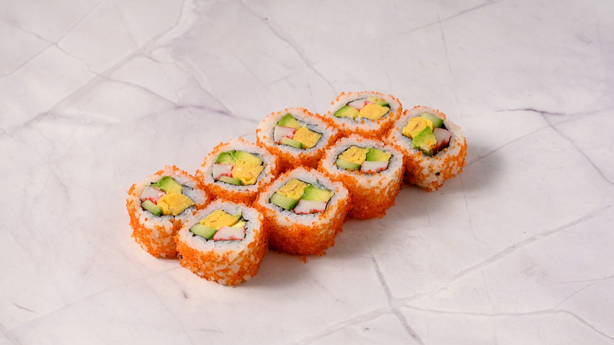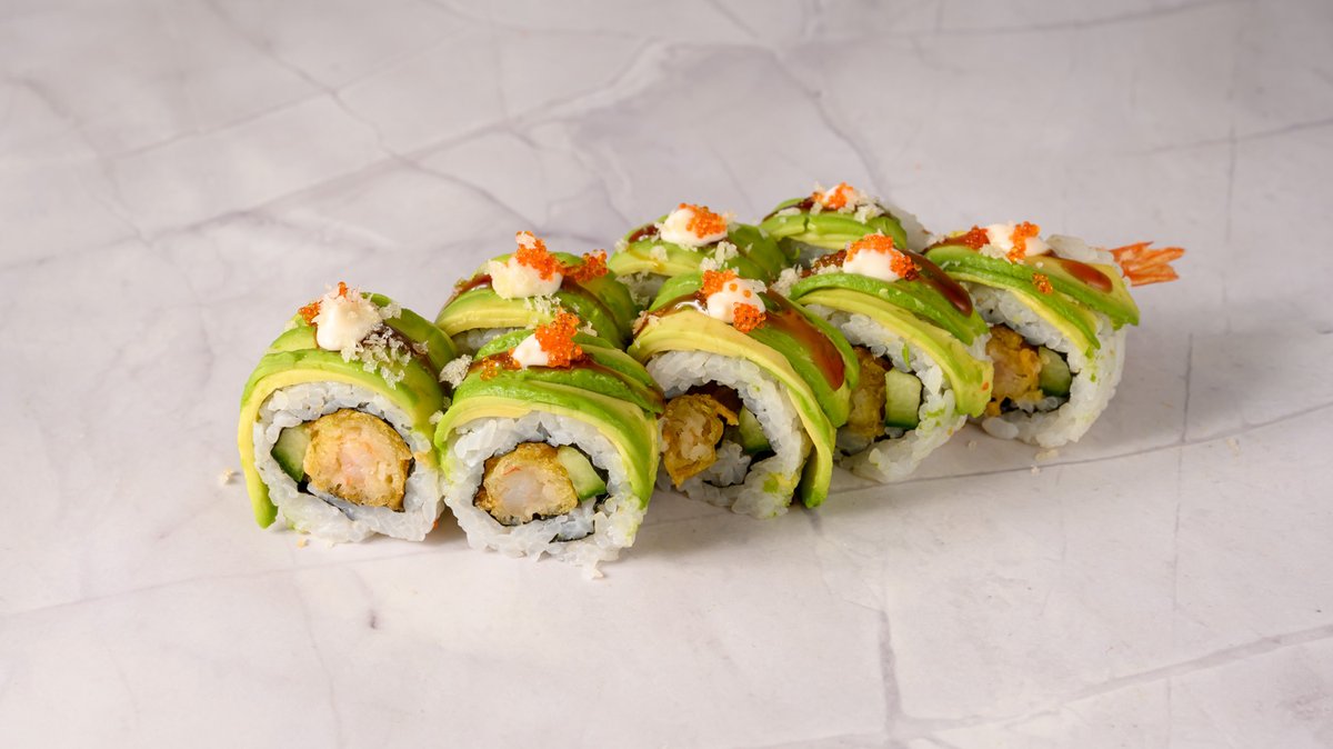 Prawn Tempura, Cucumber, Topped Avocado, Tobiko, Panko with Mayo & Teriyaki Sauce.