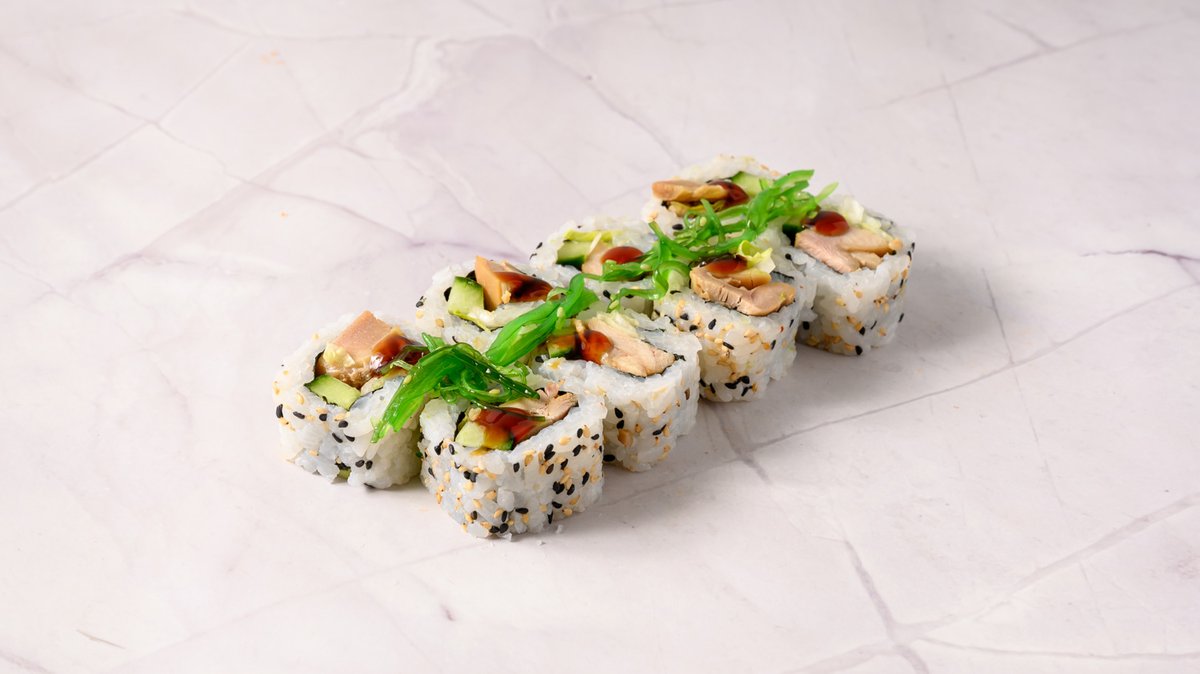 Teriyaki Chicken, Cucumber, Lettuce, Topped with Sesame Seeds, Wakame & Teriyaki Sauce.