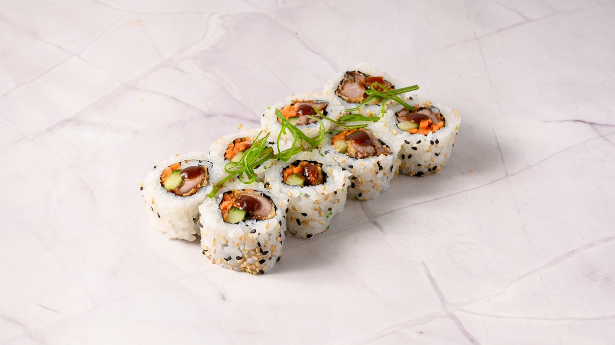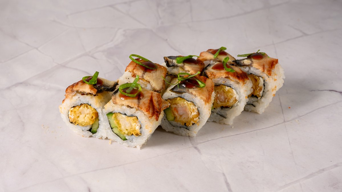 Prawn Tempura, Cucumber, Philadelphia Cheese, Topped BBQ Eel, Spring Onions with Teriyaki Sauce.