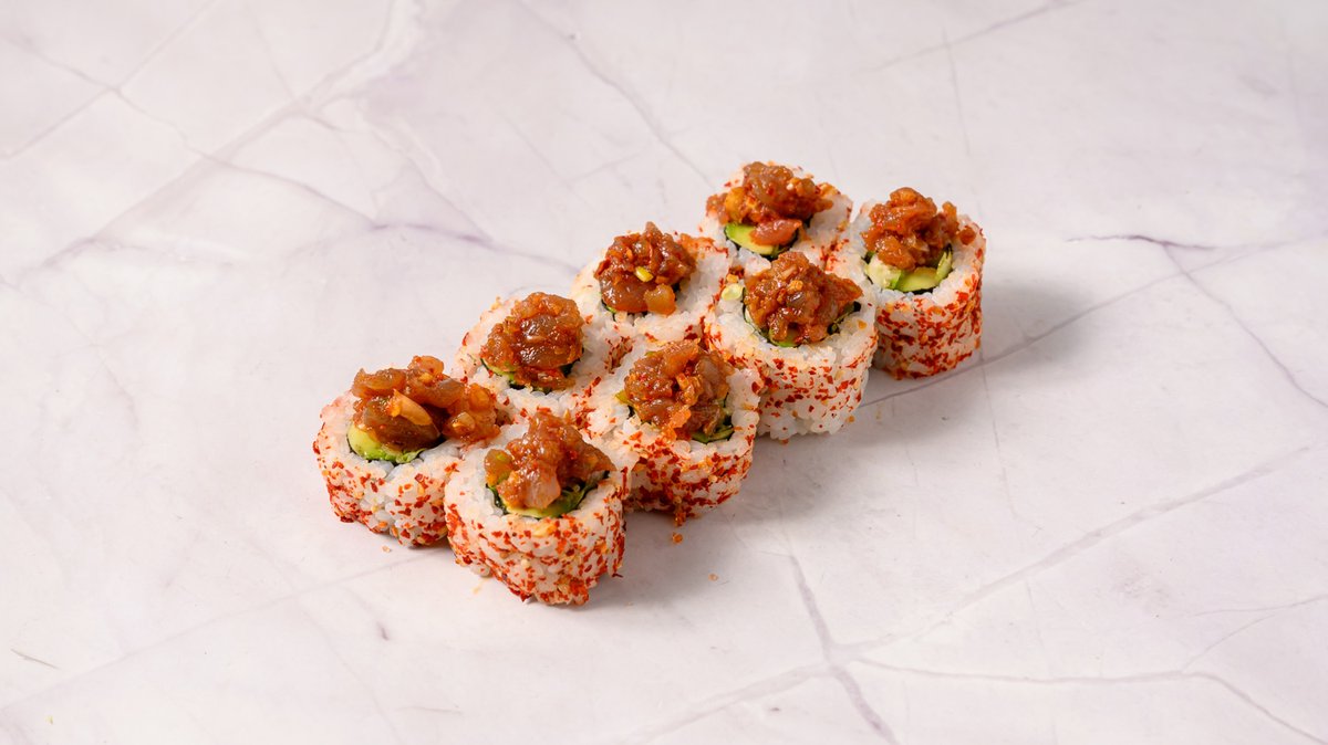 Grilled Spicy Tuna, Cucumber, Teriyaki Sauce, Topped Green Masago & Spicy Mayo.