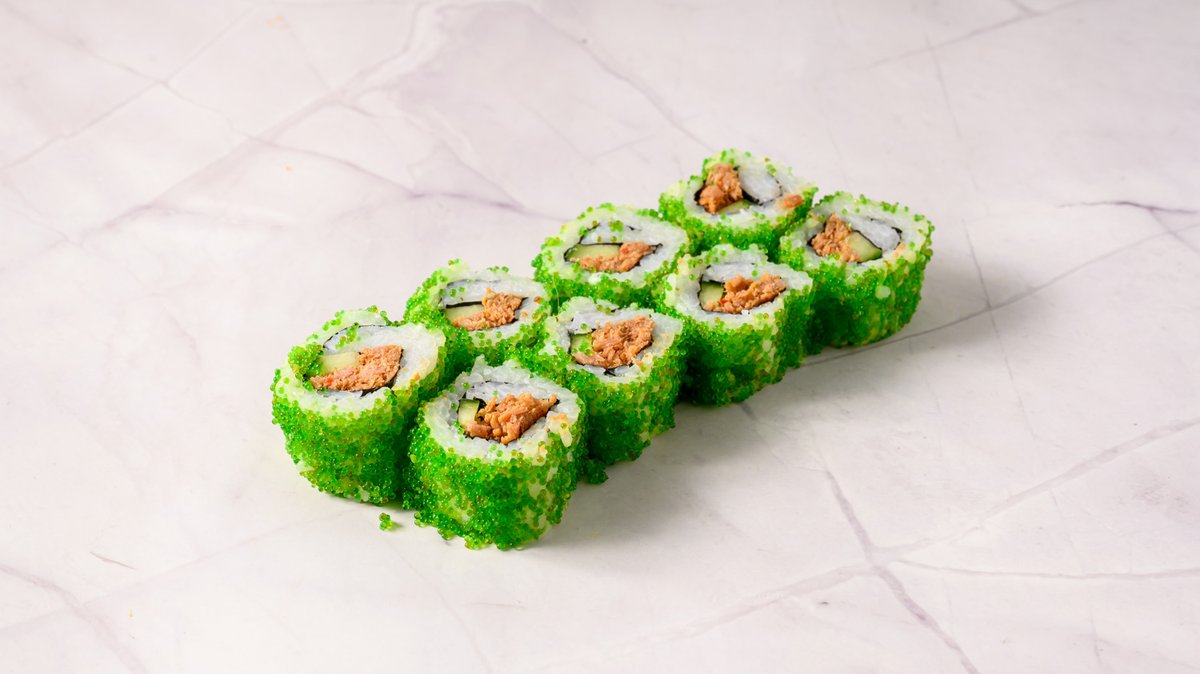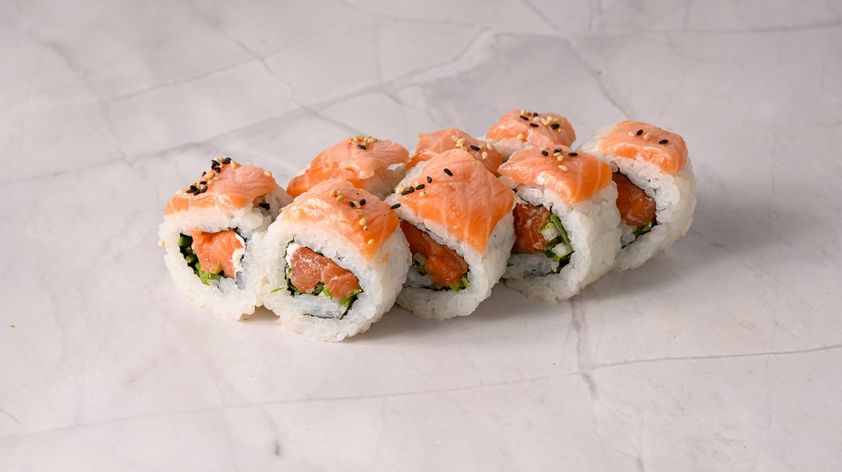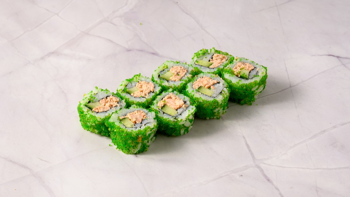 Grilled Salmon, Cucumber, Teriyaki Sauce, Topped Green Masago & Spicy Mayo.