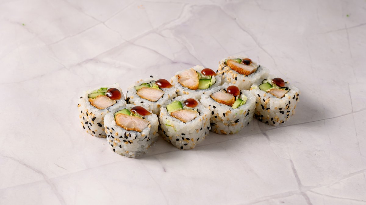 Crispy Chicken, Cucumber, Lettuce, Topped Sesame Seeds, Panko with Teriyaki Sauce.