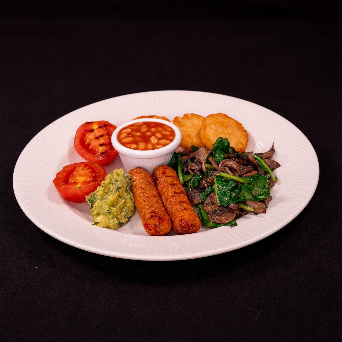 SMASHED AVOCADO, SAUTÉED SPINACH, VEGAN SAUSAGE, ROASTED TOMATOES, MUSHROOM, HASH BROWNS AND BAKED BEANS, TOASTED BREAD
