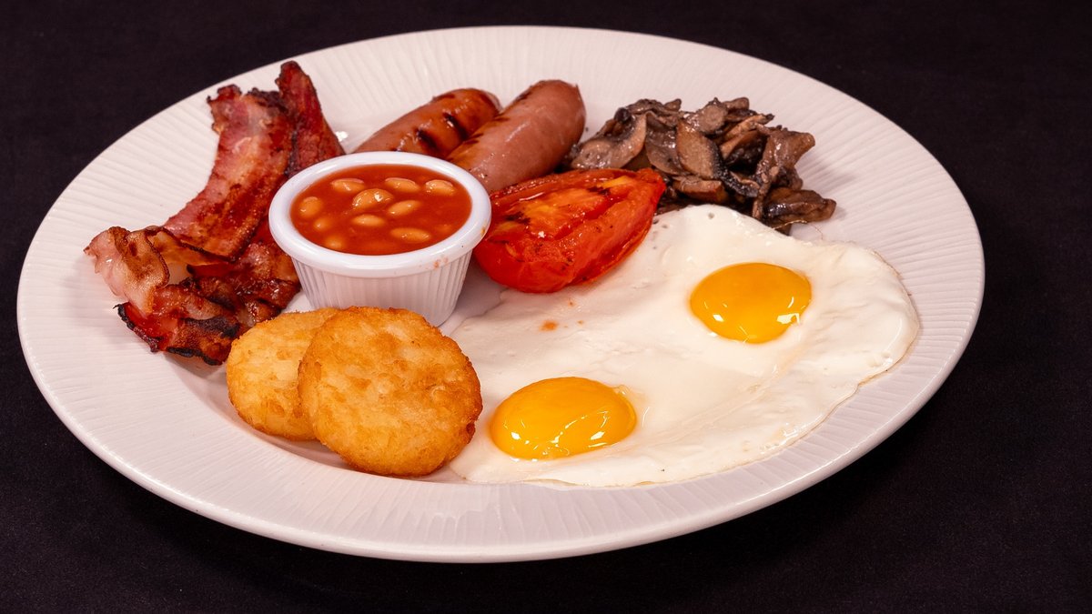 Fried Eggs, streaky bacon, local pork sausage, hash browns, baked beans, mushrooms, baked tomatoes, toasted bread