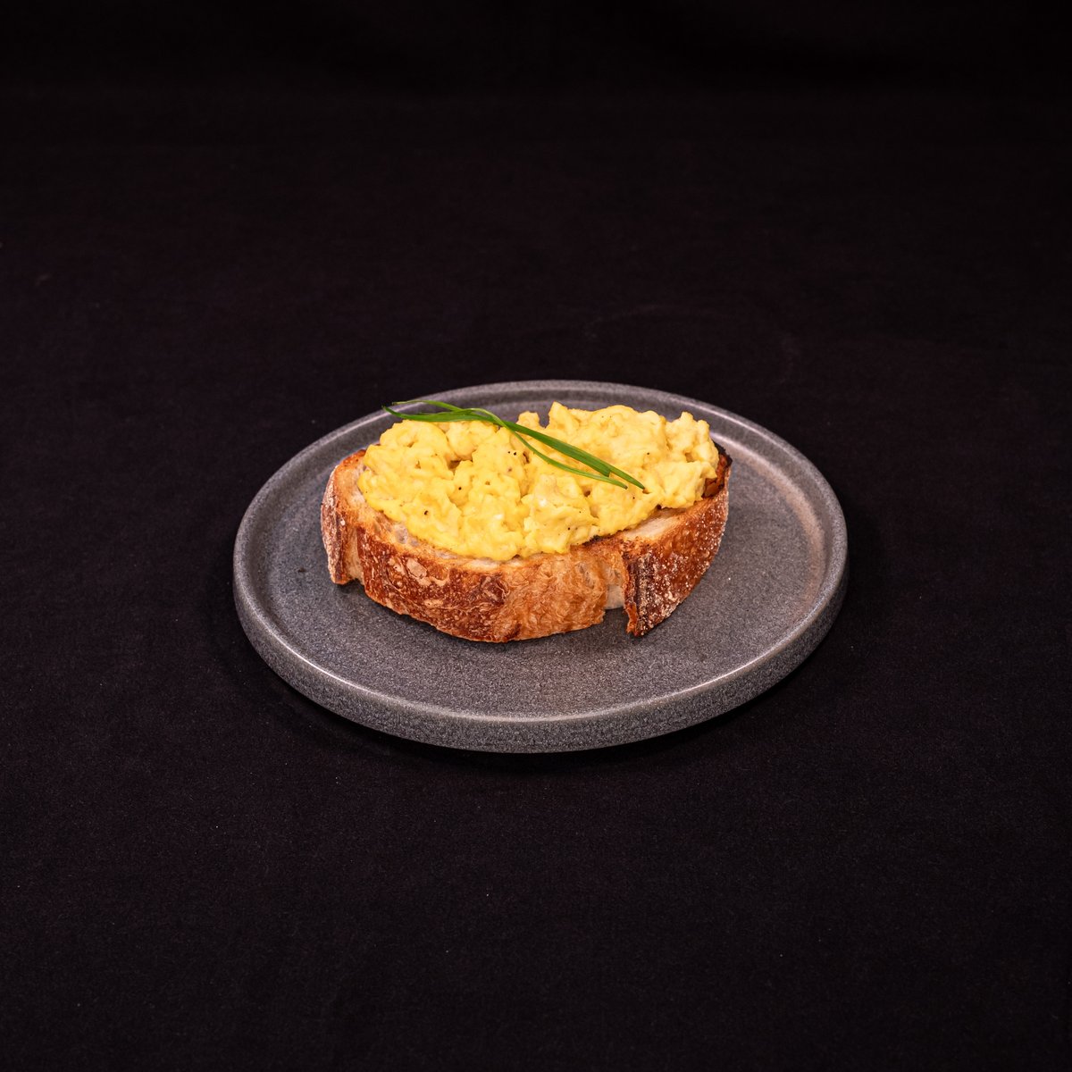 Scrambled Eggs, cream cheese, chives on toasted bread