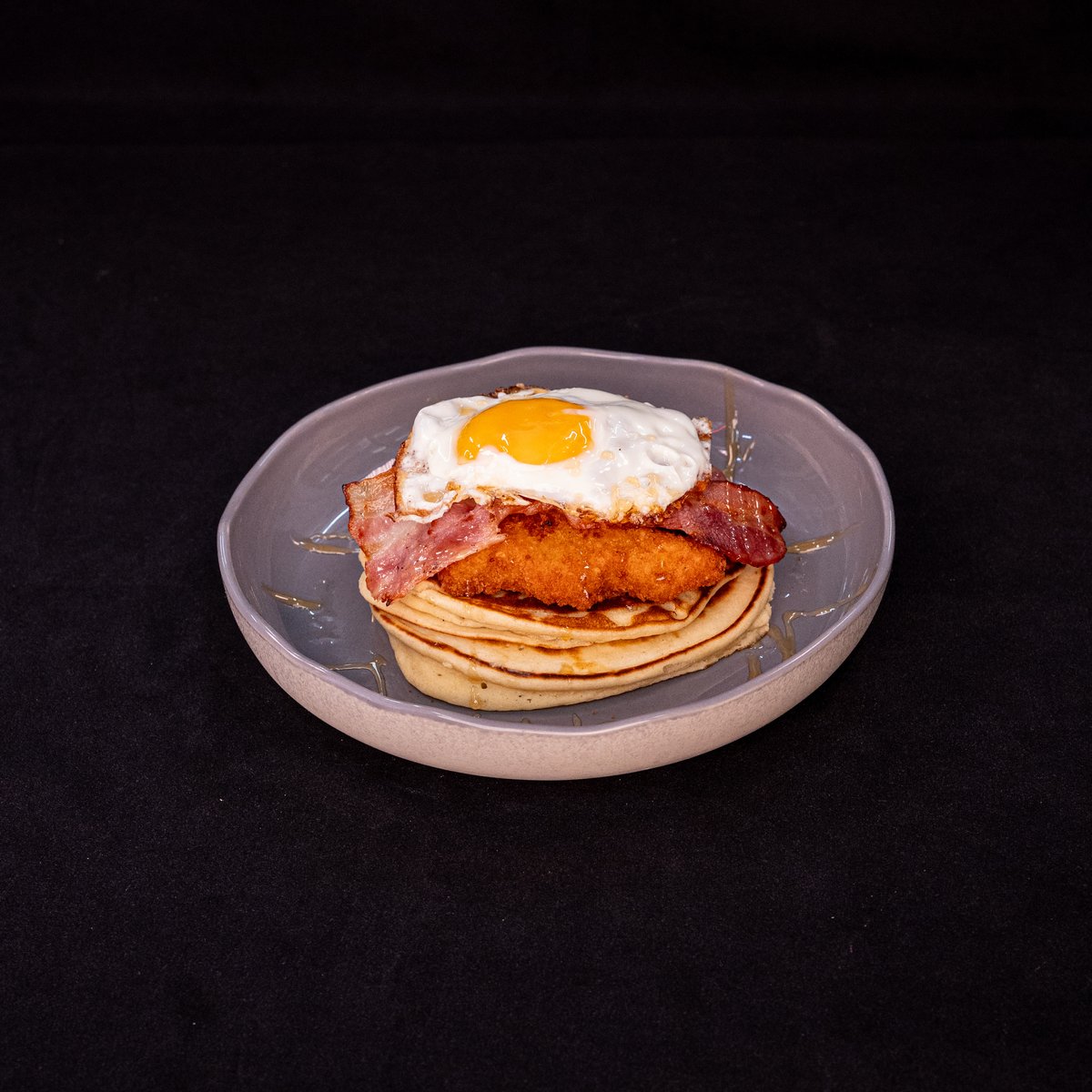 LAYERS OF TWO FLUFFY HOMEMADE PANCAKES SERVED WITH FRIED CHICKEN , GRILLED STREAKY BACON, FRIED EGG TOPPED WITH MAPLE SYRUP