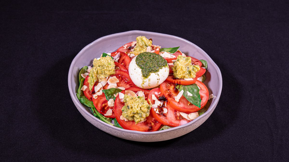 SMASHED AVOCADO, TOMATOES, BURRATA CHEESE, MIX GREENS DRESSED WITH BASIL OLIVE OIL, ALMONDS FLAKES, BALSAMIC REDUCTION