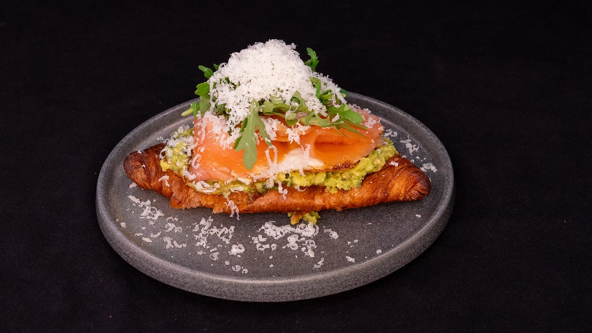 FRIED EGG, SMASHED AVOCADO, SMOKED SALMON, RUCOLA, GRANA PADANO RAIN SERVED ON A FLAT CROISSANT