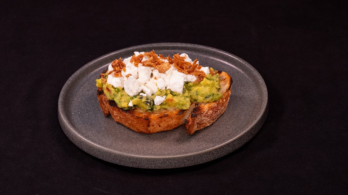 smashed Avocado, feta cheese, crispy onions on toasted local bread