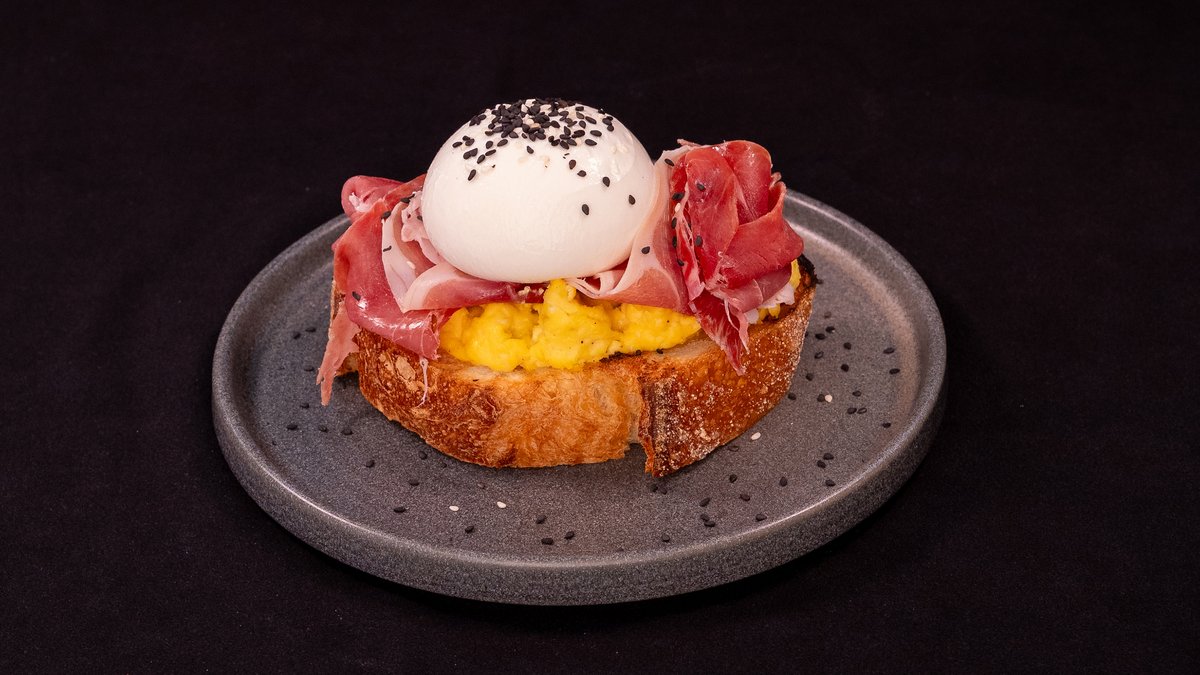 LOCAL BREAD (XIKLUN) TOPPED WITH SCRAMBLED EGGS, BURRATA CHEESE, PARMA HAM, SESAME SEEDS
