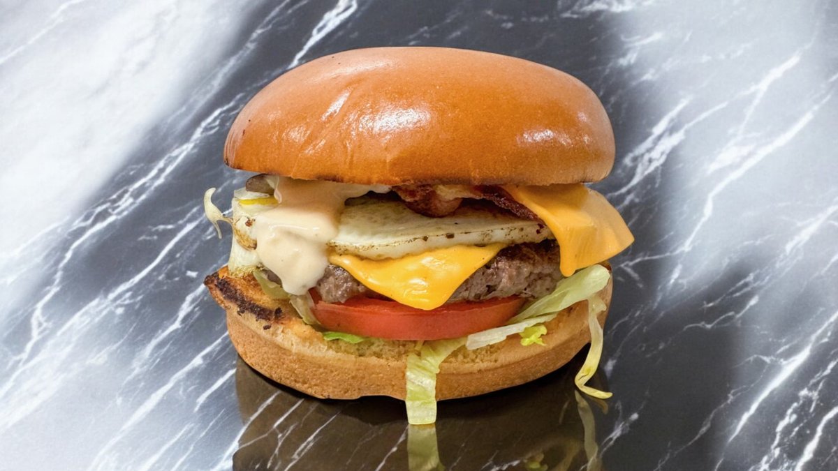 Homemade 100 % beef patty fried egg, bacon, mushrooms, cheese, tomatoes and lettuce