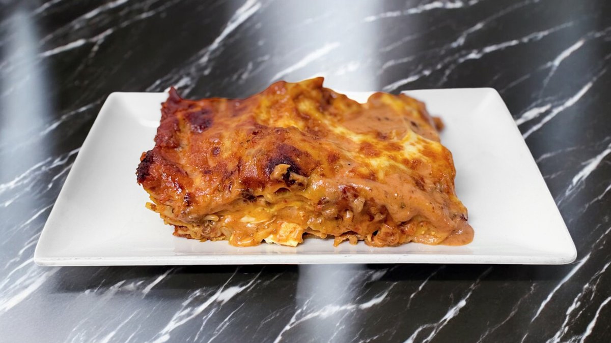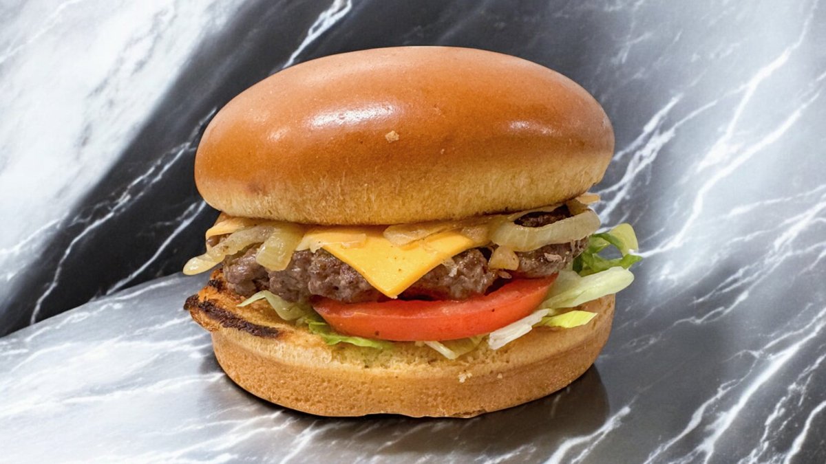 Homemade 100 % beef patty, cheese, caramelized onions, tomatoes and lettuce