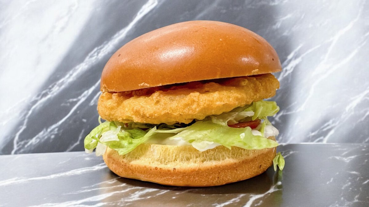 Battered chicken breast, mayonnaise, tomato and lettuce