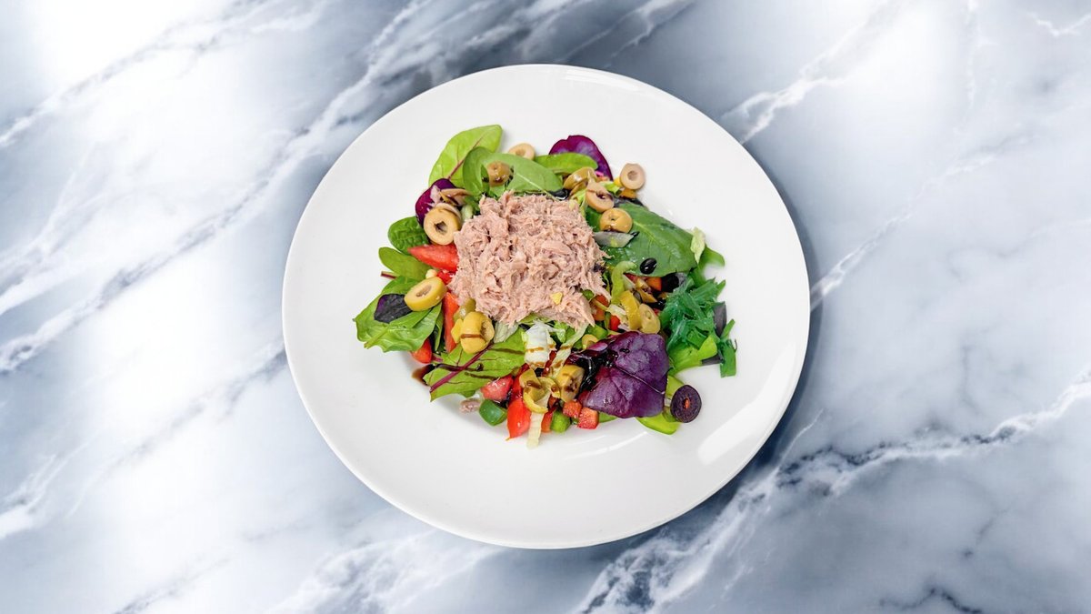 Tuna chunks, olives, beans, onions, sweet corn, lettuce and coleslaw.