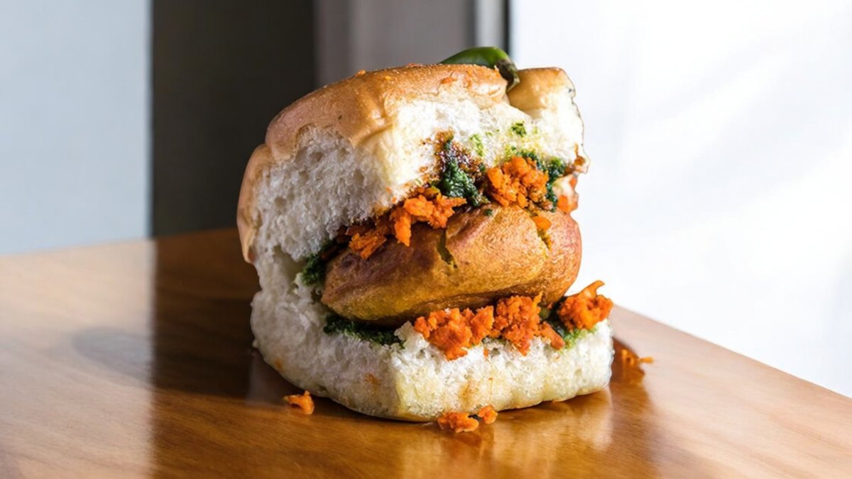 A deep fried potato dumpling placed inside a bread bun (pav) sliced almost in half through the middle. It is generally accompanied with one or more chutneys and a green chilli pepper