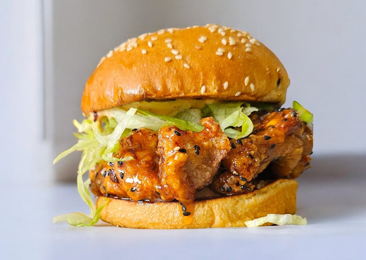 Super soft potato bun, buttermilk fried chicken thigh, carob syrup, crispy bacon, sliced onion, shredded iceberg lettuce and house sauce. Served with tallow fries