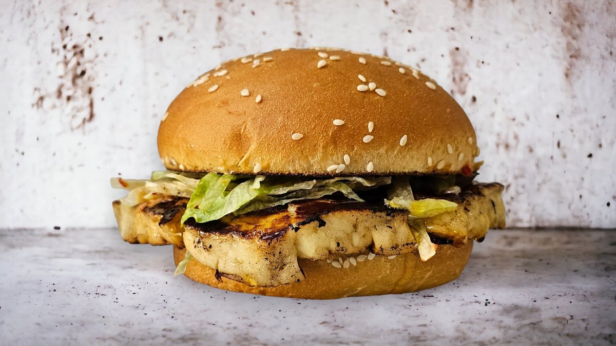 Super soft potato bun, smashed honey glazed halloumi, sliced onion, shredded iceberg lettuce and house sauce. Served with vegan fries