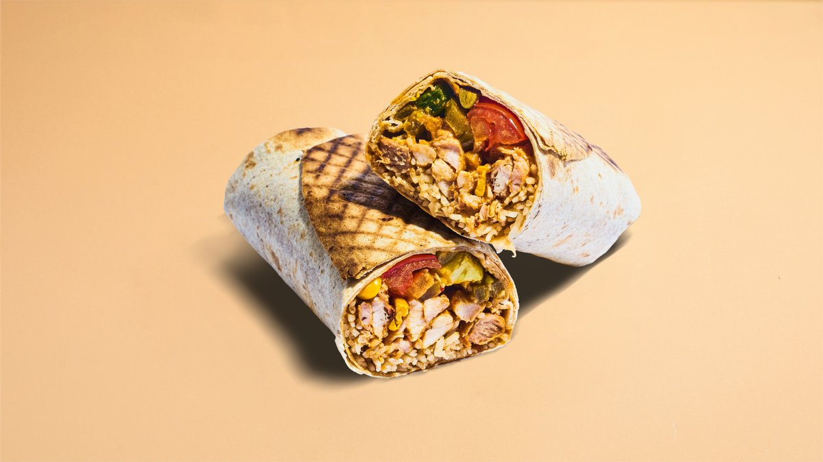 Pulled beef, parmesan, red onion, cherry tomato, peppers, whole-wheat wrap, and spicy ranch dressing. 731 kcal. / 34g P / 41g C / 44g F