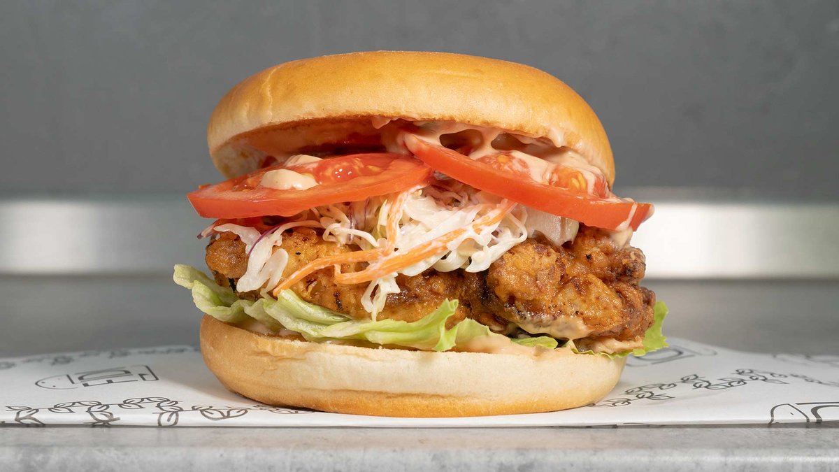 Buttered chicken thighs, coleslaw, tomatoes, lettuce and secret sauce in a toasted potato bun