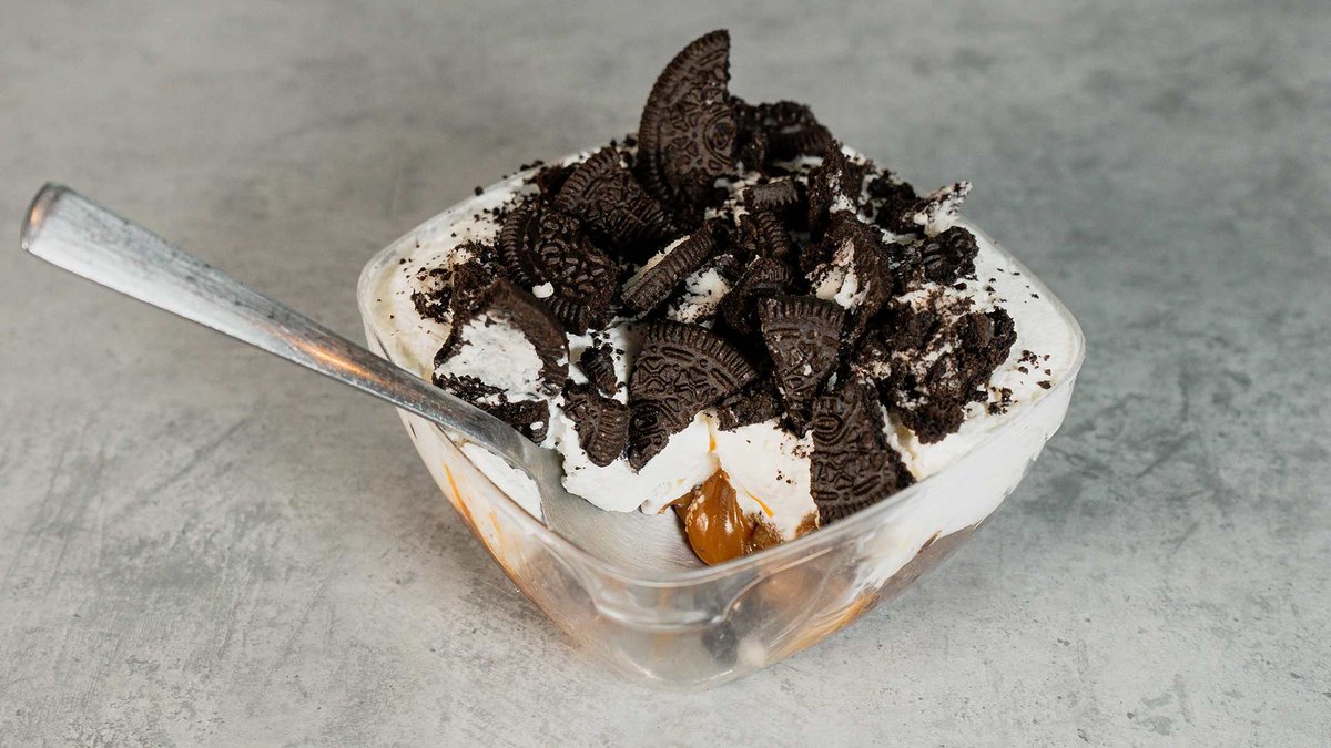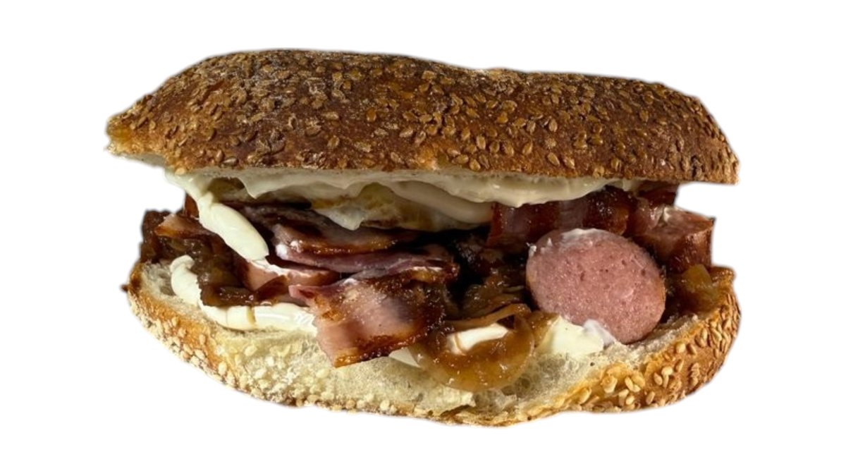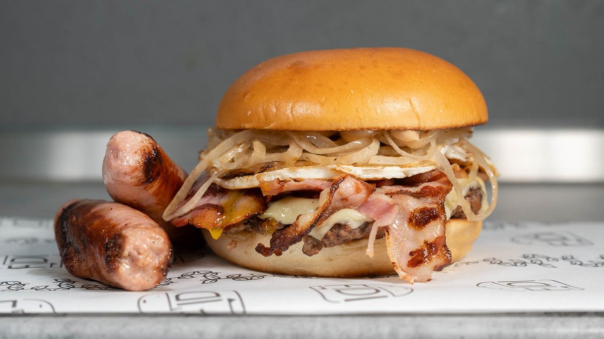 Grilled beef patty 160g, fried egg, bacon, cheddar cheese, sautéed onions, secret sauce in a toasted potato bun and two fried pork sausages