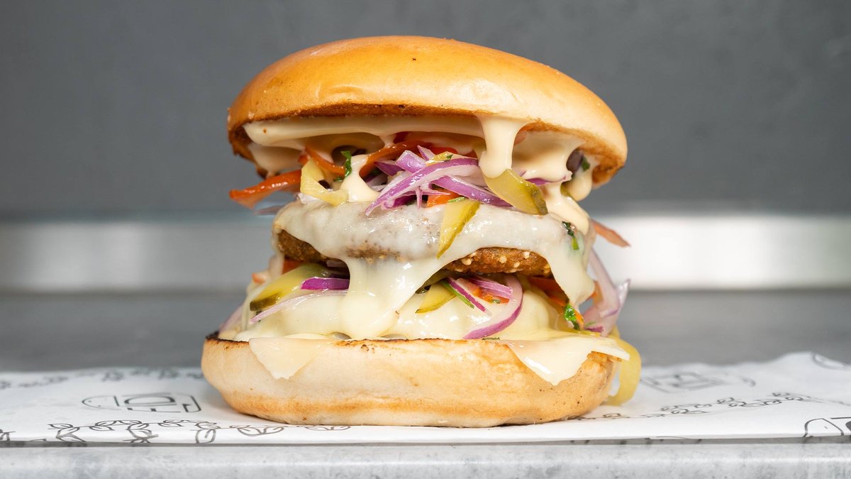 Double quinoa and kale patty with melted vegan cheese and fresh onion, tomato and gherkins salad with mustard mayonnaise in a toasted potato bun