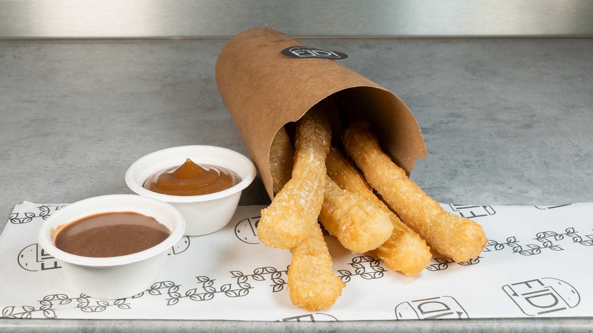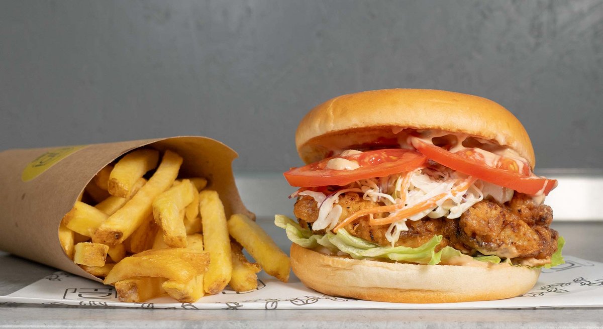 Home-made F’IDI buttermilk chicken topped with bacon, brie cheese, and iceberg lettuce, finished with cranberry mayo and caramelised onion jam, served in a toasted potato bun with fries. Comes with a side of a bacon-wrapped sausage.