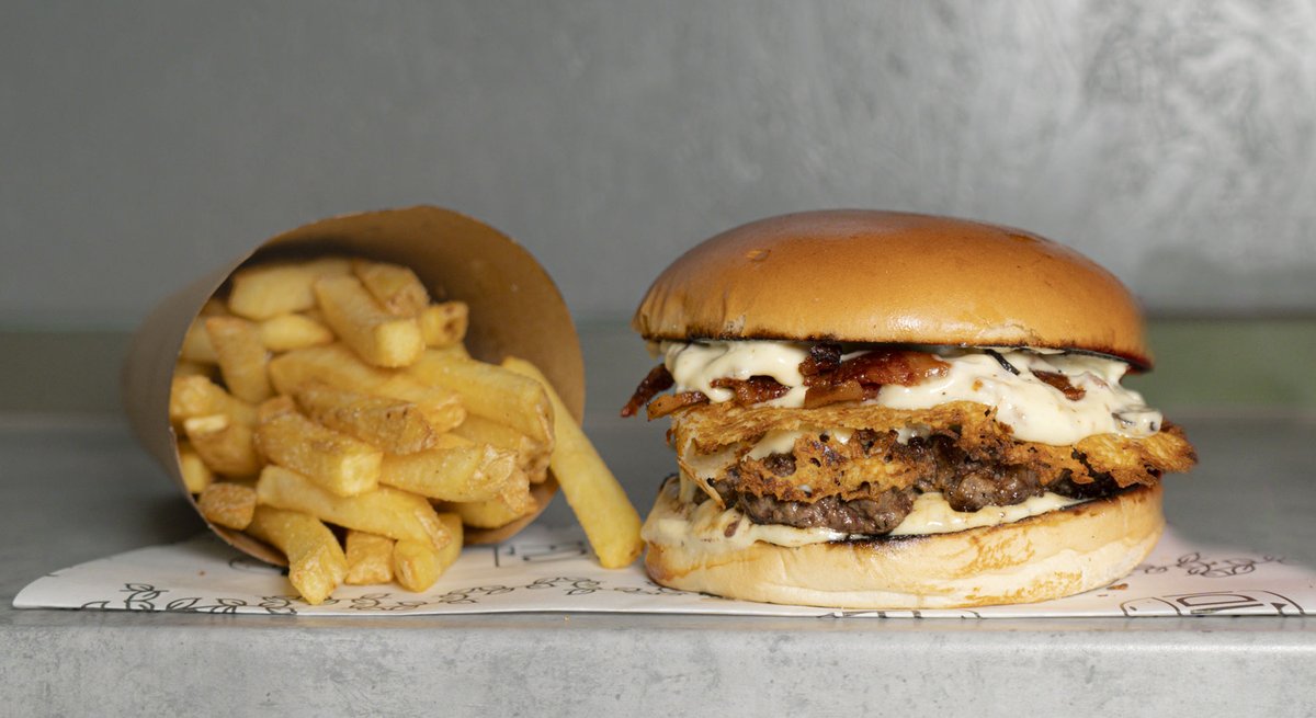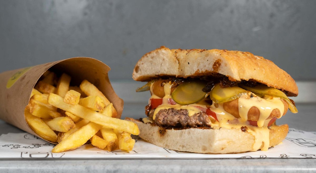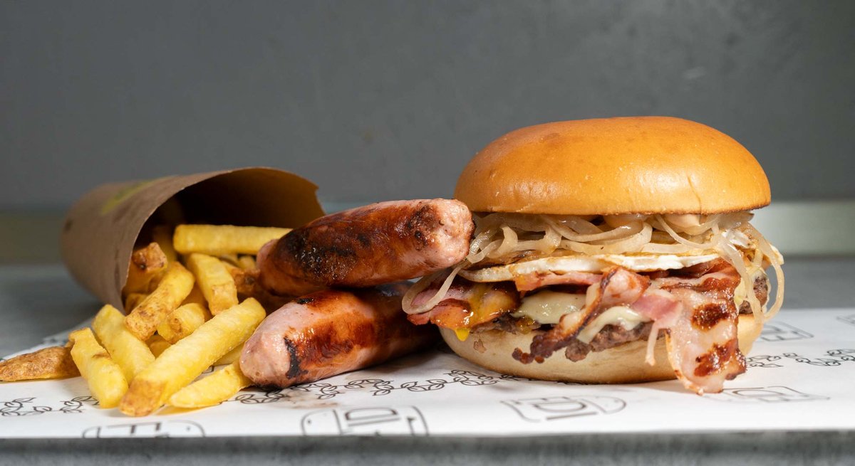 Grilled beef patty 160g, fried egg, bacon, cheddar cheese, sautéed onions, secret sauce in a toasted potato bun and two fried pork sausages with fries