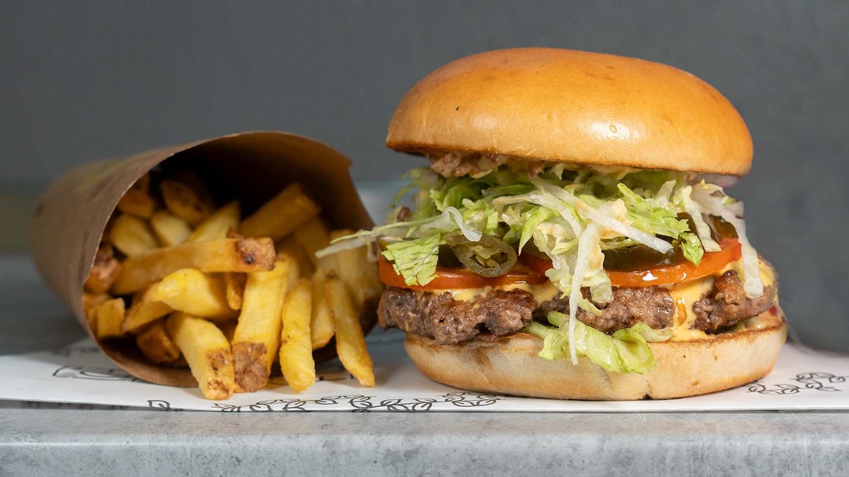 Grilled beef patty 160g, tomatoes, pickles, cos lettuce, red onion rings and secret sauce in a toasted potato bun with fries