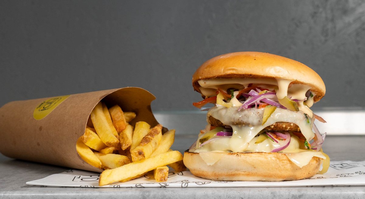 Double quinoa and kale patty with melted vegan cheese and fresh onion, tomato and gherkins salad with mustard mayonnaise in a toasted potato bun with fries
