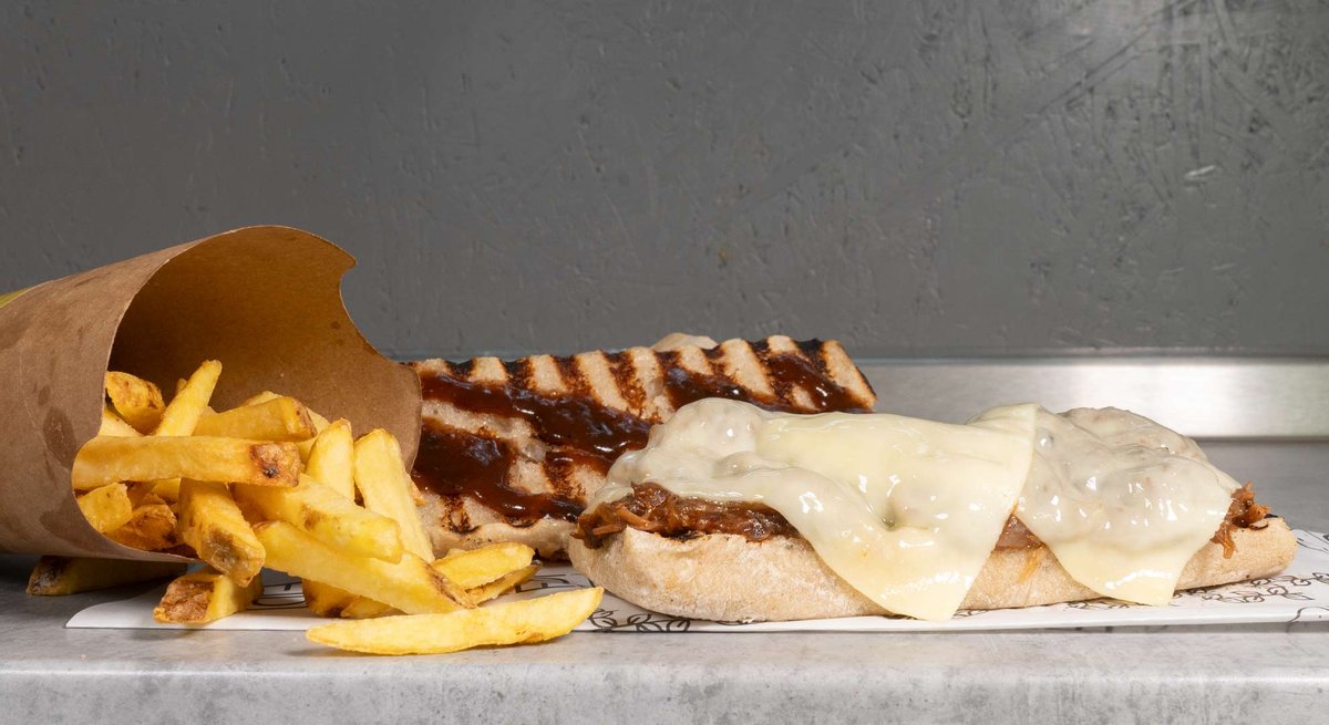 Slow cooked and smoked pulled pork, melted cheese, caramelized onions, barbecue sauce in a toasted ciabatta with fries
