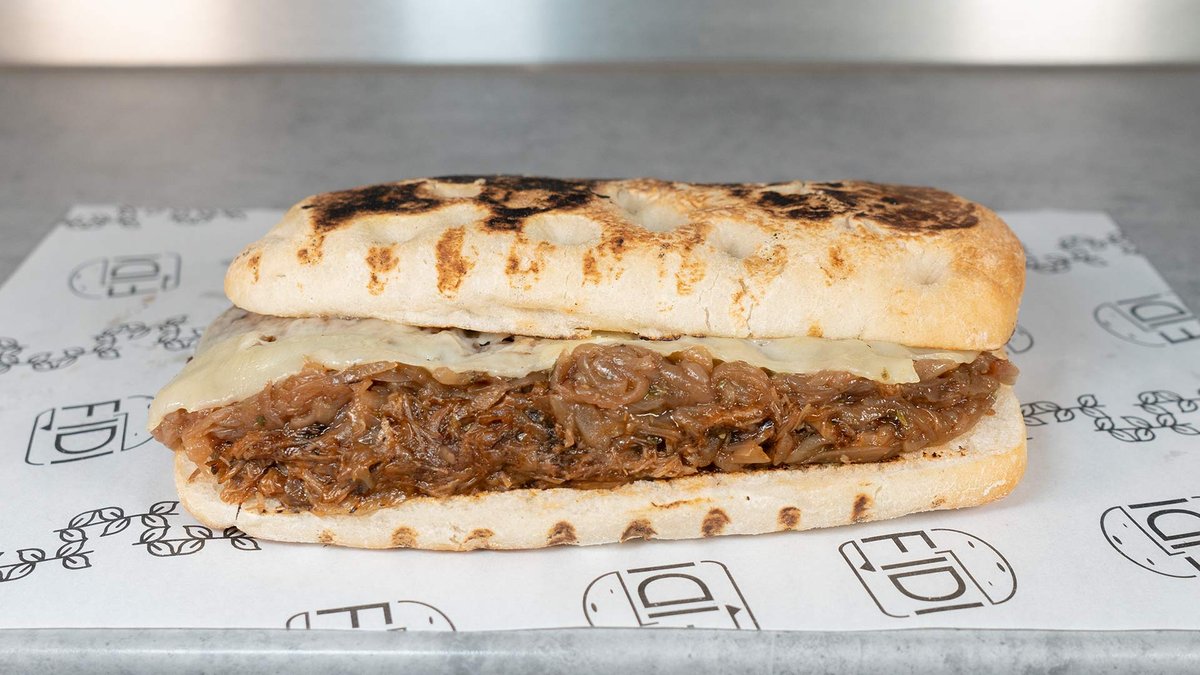 Slow cooked and smoked pulled pork, melted cheese, caramelized onions, barbecue sauce in a toasted ciabatta.