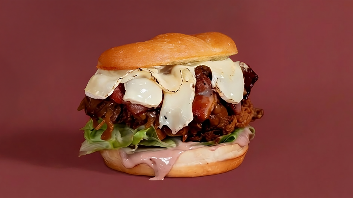Home-made F’IDI buttermilk chicken topped with bacon, brie cheese, and iceberg lettuce, finished with cranberry mayo and caramelised onion jam, served in a toasted potato bun. Comes with a side of a bacon-wrapped sausage.
