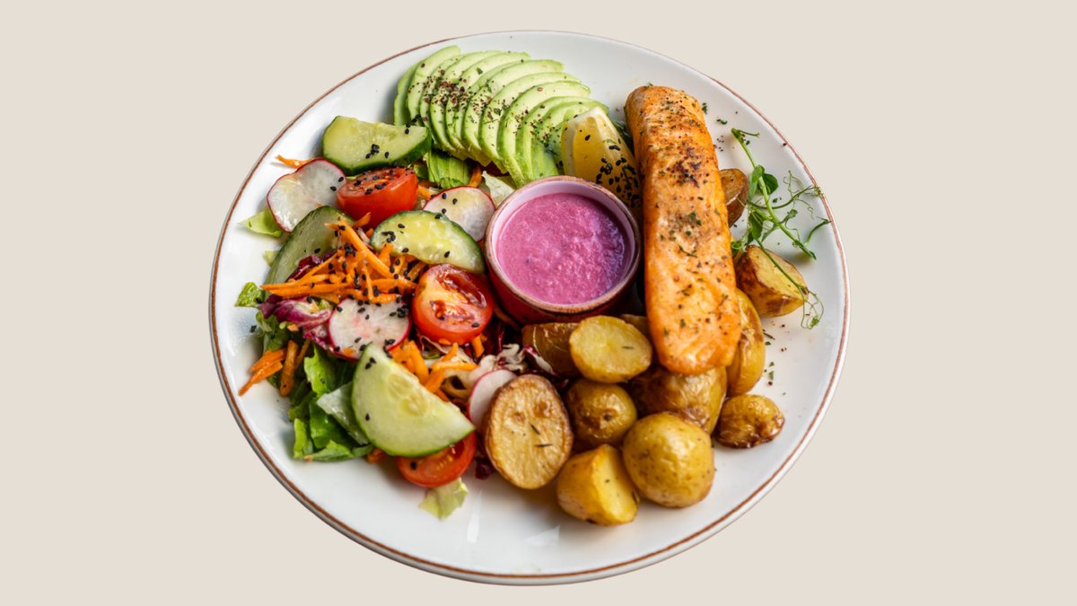 Grilled Salmon served with roasted potatoes, side salad, half avocado, black sesame seeds, pea shoot, parsley, sumac and beetroot sauce. 685 kcal, P: 42g, C: 44g, F: 38g