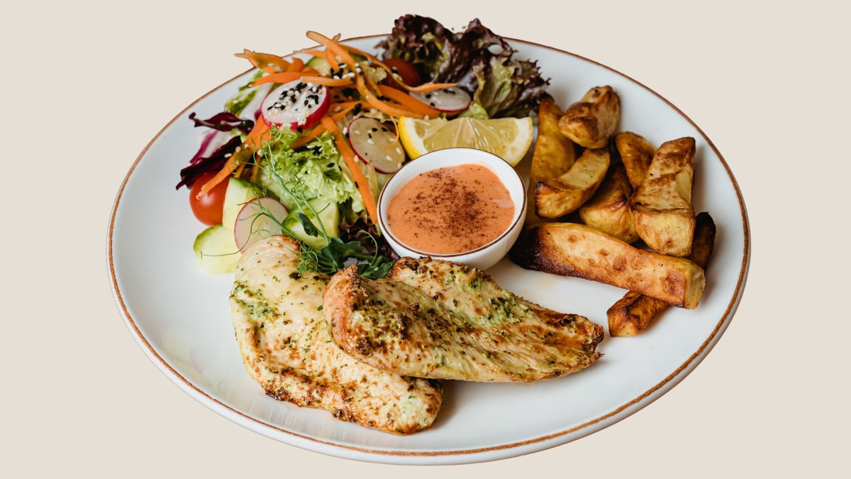 Labneh cheese and basil marinated chicken, baked potato chips, chilli mayo sauce. Served with side salad, sesame seeds, parsley and sumac. 613 kcal, P: 59g, C: 32g, F: 22g