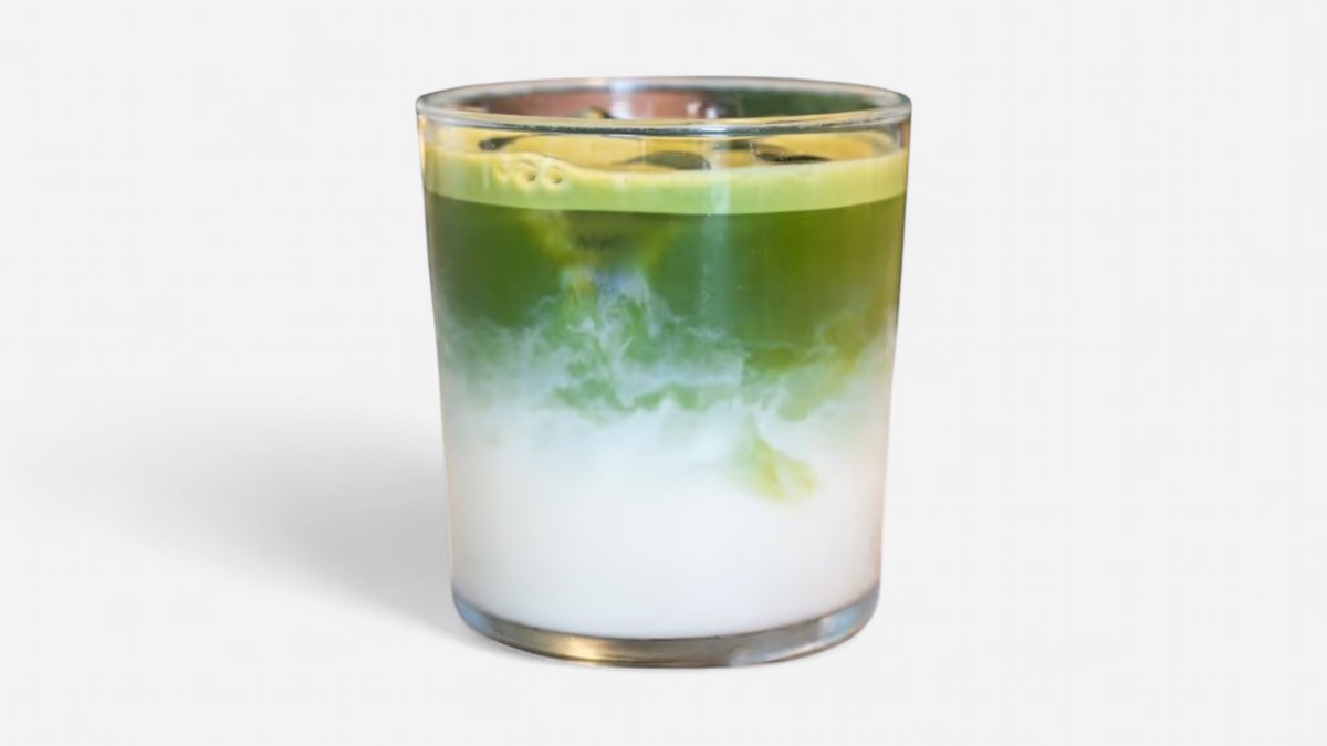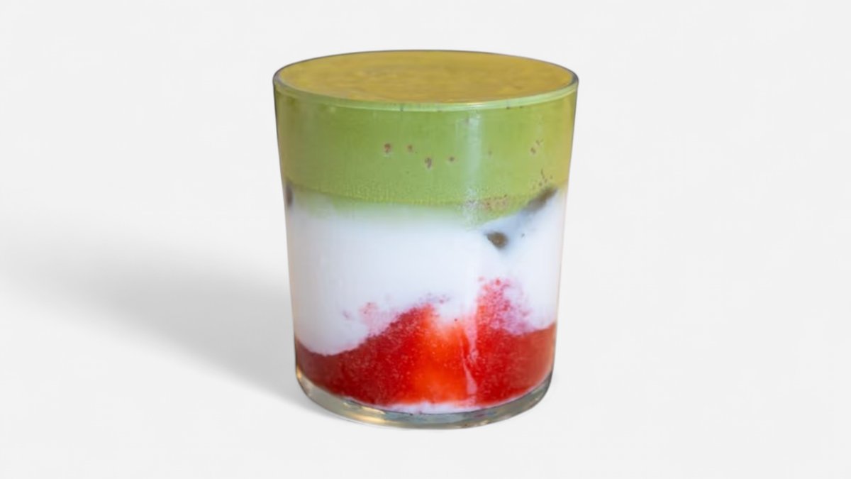 Sweet strawberry-infused milk, topped with a rich blend of green matcha and light coconut cream cloud.