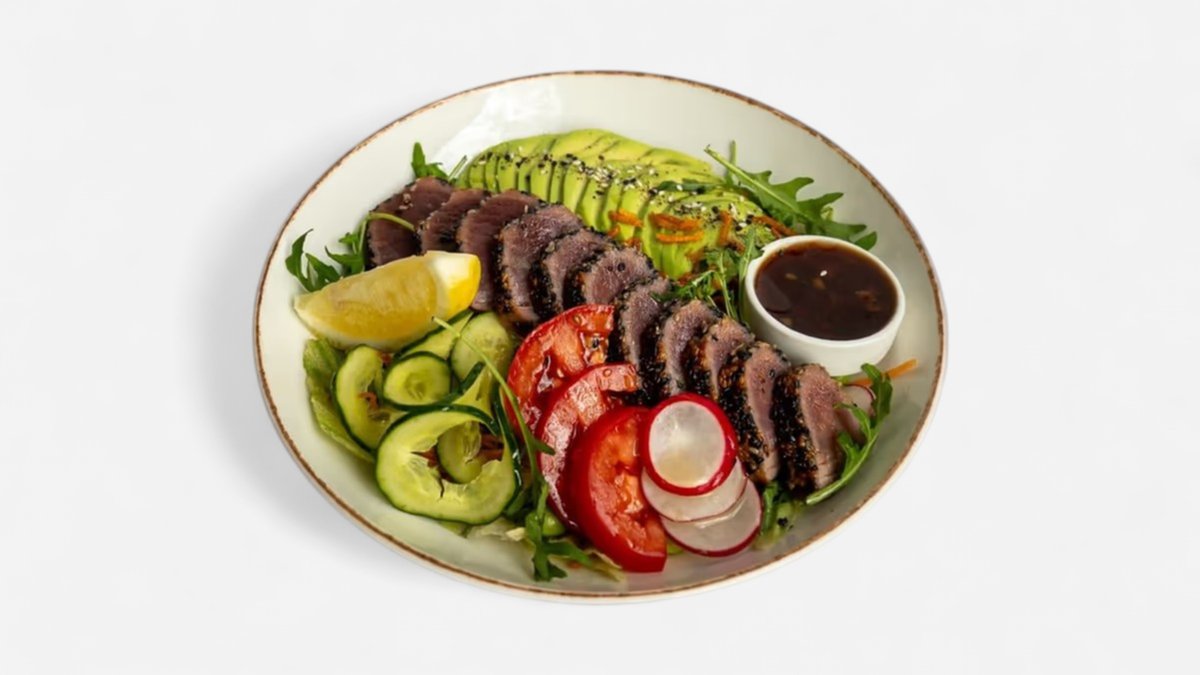 170 g sesame coated seared tuna (medium rare), mixed lettuce leaves, sweet potato fritters, half avocado, tomatoes, cucumbers, sweet chilli soy dressing. 591 kcal, P 56.2g, C 29.2g, F 30.2g