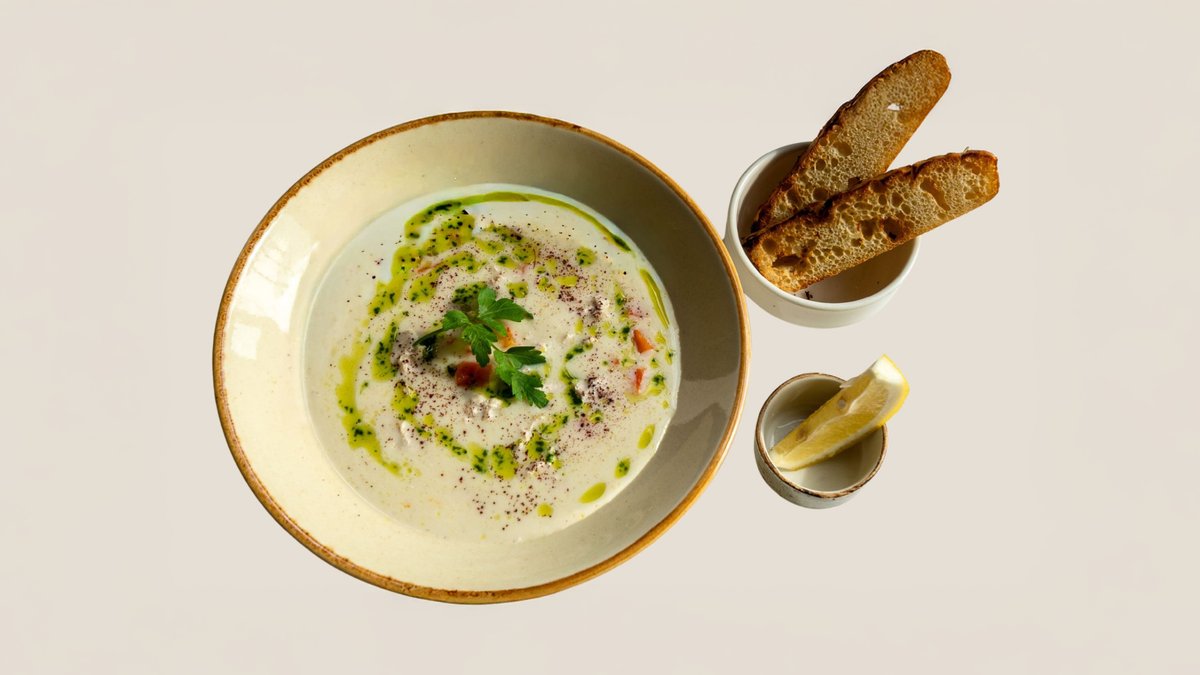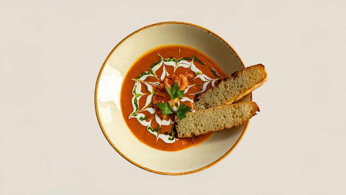 Vegan and gluten free roasted tomato soup white beans, sweet paprika and garlic. 194 kcal P: 7,2g C: 25g F: 7,4g All our soups are served with two pieces of homemede foccacia (98 kcal P: 2,7g, C: 19,4g, F: 1g)