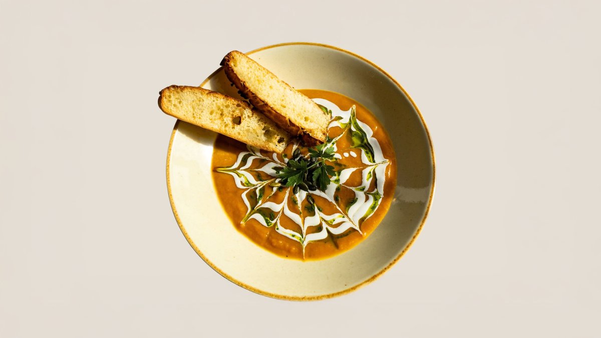 Vegan and gluten free pumpkin soup with sweet potatoes, carrots and celery. 160 kcal P 3,5g, C 26g, F 5g All our soups are served with two pieces of homemede foccacia (98 kcal P: 2,7g, C: 19,4g, F: 1g)