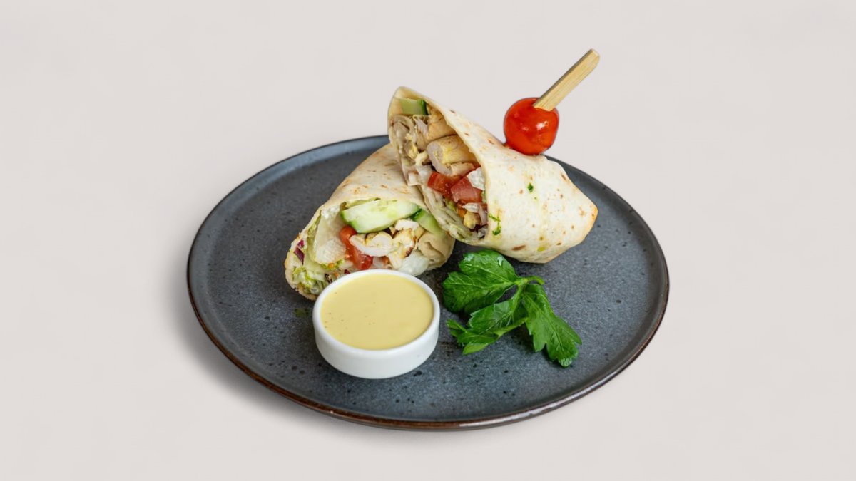 Strips of honey mustard marinated chicken and seasonal grilled veggies in a tortilla wrap. Served with honey mustard sauce. 530 kcal, P: 36g, F:20g, C:49g