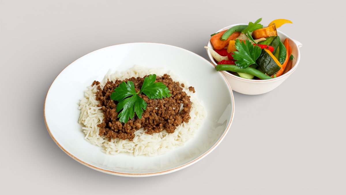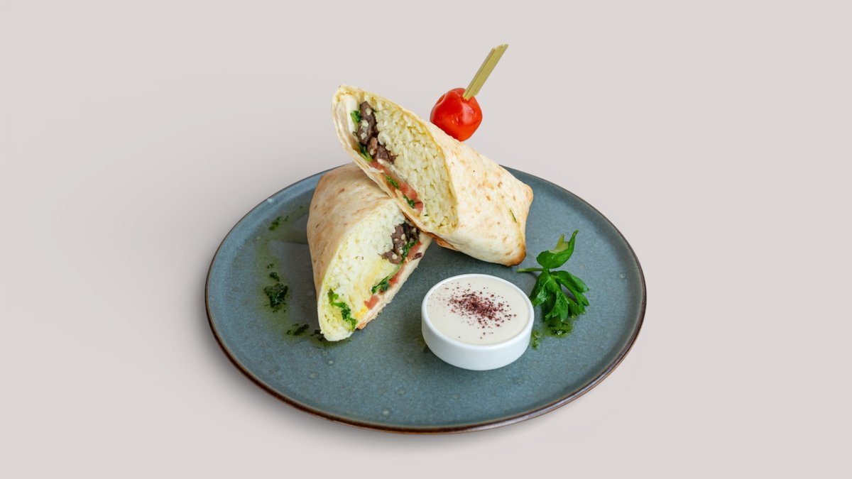 Marinated beef strips, cheddar cheese, basmati rice, garlic mayo, tomato, cucumber, peppers, warm tortilla wrap, garlic mayo. 625 kcal, P: 41g, F: 22g, C: 66g