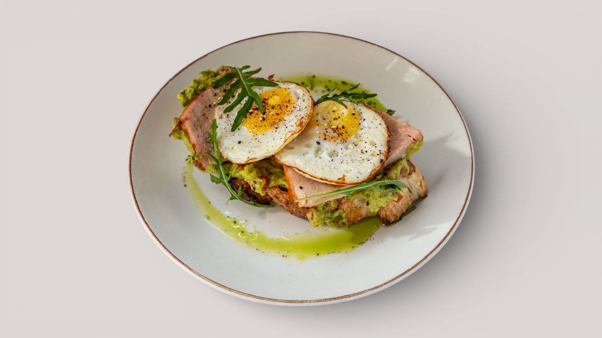 Sourdough bread, homemade guacamole, turkey ham, choice of 2 fried or poached eggs, rucola, herb oil drizzle, seed garnish. 453 kcal | P: 34g, C: 27g, F: 20g
