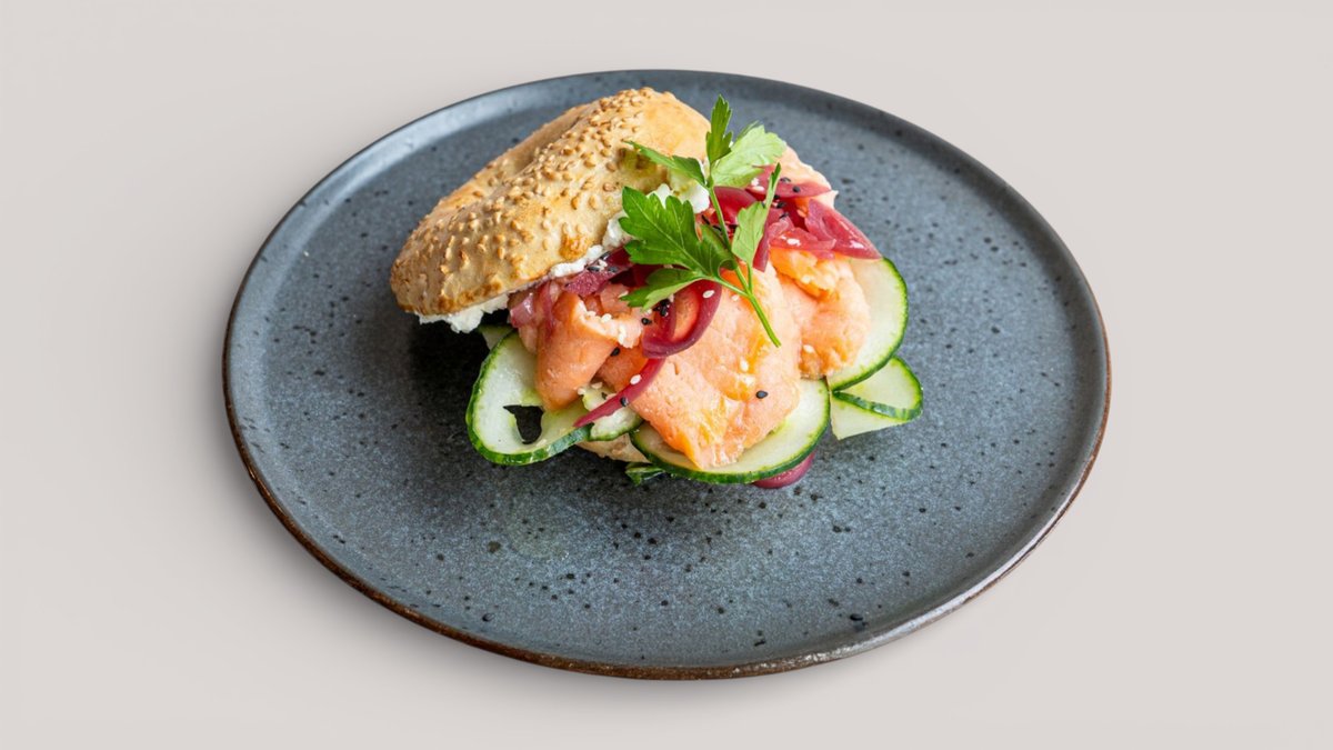 Toasted sesame bagel, smoked salmon, cream cheese, pickled onions, fresh cucumber. 556 kcal P: 30g, C: 58g, F: 22g