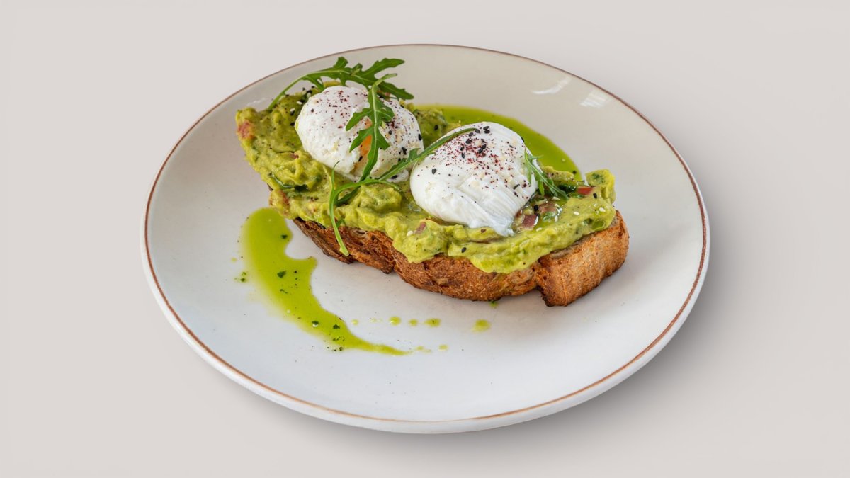 Sourdough bread, homemade guacamole, poached eggs, rucola, seed garnish. 333 kcal | P: 17g, C: 26g, F: 17g