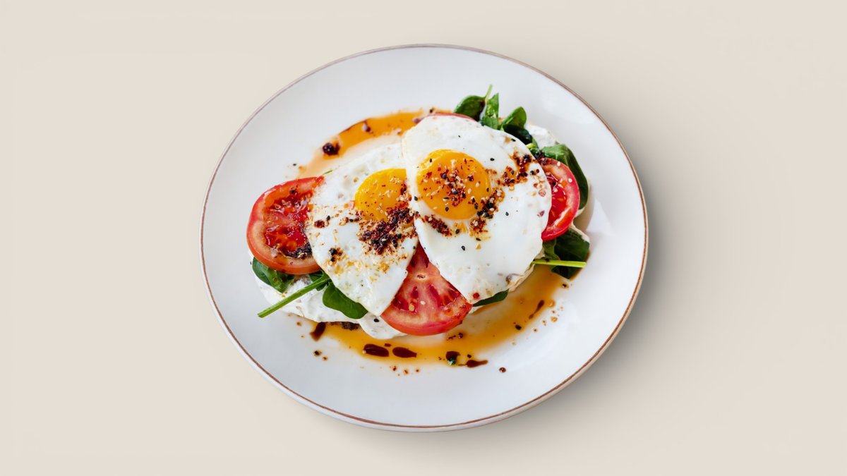 Two fried eggs on tomatoes and spinach, on a herb cream cheese spread over sourdough, finished with a drizzle of chilli olive oil. 479 kcal P: 24 g, C: 49 g, F: 20 g